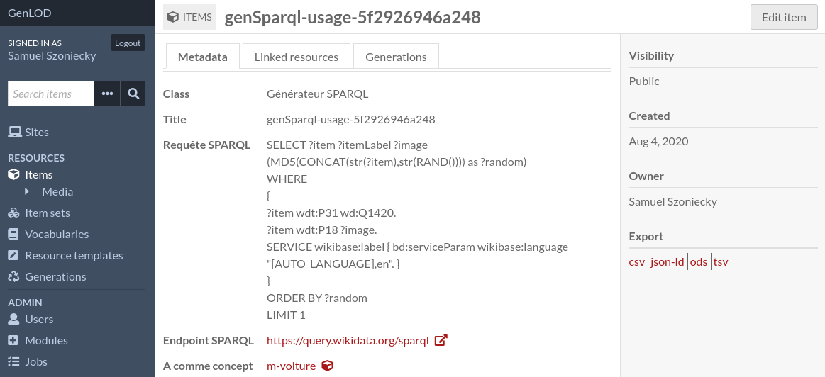 Cette première version reprend intégralement les principes des générateurs balpiens notamment les dictionnaires de concepts (494838 items) et les algorithmes de cohérence des syntaxes. Cette version a été développée sous la forme d’un module Omeka S en collaboration avec Daniel Berthereau. Les données disponibles sont consultables ici : https://jardindesconnaissances.univ-paris8.fr/genlod/omk/s/donnees-disponibles/item . Le code source est accessible ici : https://github.com/samszo/omeka-s-module-generateur .