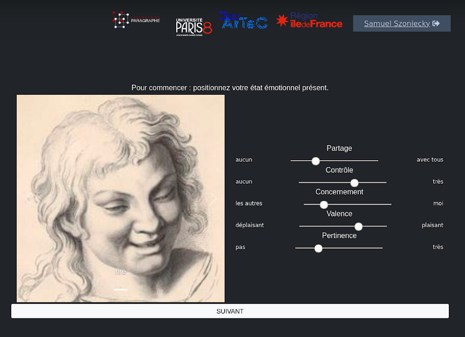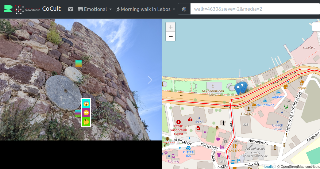 La figure ci-dessus Figure 3.1 présente une interface utilisateur en cours de réalisation pour témoigner en temps réel d’une expérience culturelle à partir de photographie que l’on annote avec un crible conceptuel Section 3.7. La partie droite montre ou se situe la photographie sur la carte. Sur le côté gauche, des annotations basées sur une liste prédéfinie de sentiments sont placées sur la photographie.
