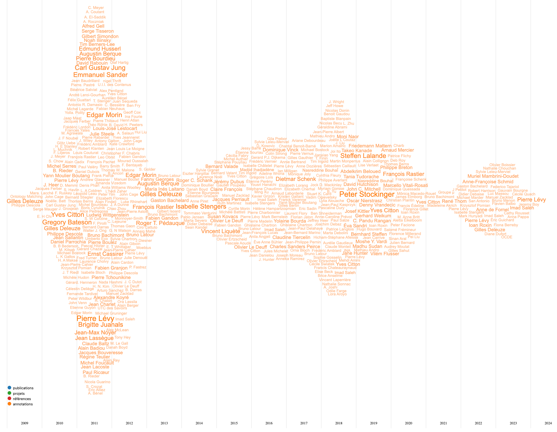 Le diagramme ci-dessus Figure 6.4 montre l’évolution de l’importance des personnes par rapport au nombre d’annotations que j’ai fait de leurs publications. Les annotations commencent en 2009 ce qui correspond au début de mon usage de Zotero cf. Section 4.3, puis atteignent un pic durant les recherches en thèse. Ces annotations donnent une bonne idée de l’importance des auteurs dans mon travail de recherche en montrant les personnes que j’ai le plus étudiées lors de mon parcours intellectuel. S’il fallait n’en retenir que quelques-uns, il y a bien évidemment les personnes dont j’ai parlé au début de cette partie cf. Chapter 2 et plus particulièrement Gilles Deleuze que je lis depuis une trentaine d’années et que j’écoute32 régulièrement. Grâce à lui, j’ai trouvé les bases théoriques du modèle d’écosystème de connaissances cf. Section 2.2 que j’utilise dans mes recherches notamment à travers ses interprétations de Spinoza et plus particulièrement de l’Ethique. Pierre Lévy est aussi très présent tant par les enjeux scientifiques que Brigitte Juanals et Jean-Max Noyer (Juanals & Noyer, 2010) ont bien définis, auxquels il tente de répondre cf. Section 2.2.2.1 , que par la volonté d’opérationnaliser sa pensée en concevant des outils spécifiques. Je pense aussi à Yves Citton dont les écrits mon beaucoup inspirés (Citton, 2008b, 2014) et dont les conversations ont stimulé de nombreuses réflexions. D’autres personnes sont représentées de manière moins visible, car quantitativement moins présente dans ma base de connaissances, mais dont la lecture m’a beaucoup apportée. Par exemple, Bruno Latour dont le projet de modélisation de modes d’existences (Latour, 2012) en lien avec l’expression de nouveaux carnets de doléances (Latour, 2017) me semble une des perspectives les plus intéressantes pour les recherches en intelligence collective. De même, Bruno Bachimont n’a pas l’importance dans ce diagramme de celle qu’il a dans mes recherches, car la clarté de ses propositions (B. Bachimont et al., 2011; B. Bachimont, 2020; Bruno. Bachimont, 2007) m’amène à mieux comprendre l’impact des intériorités dans le processus de signification.