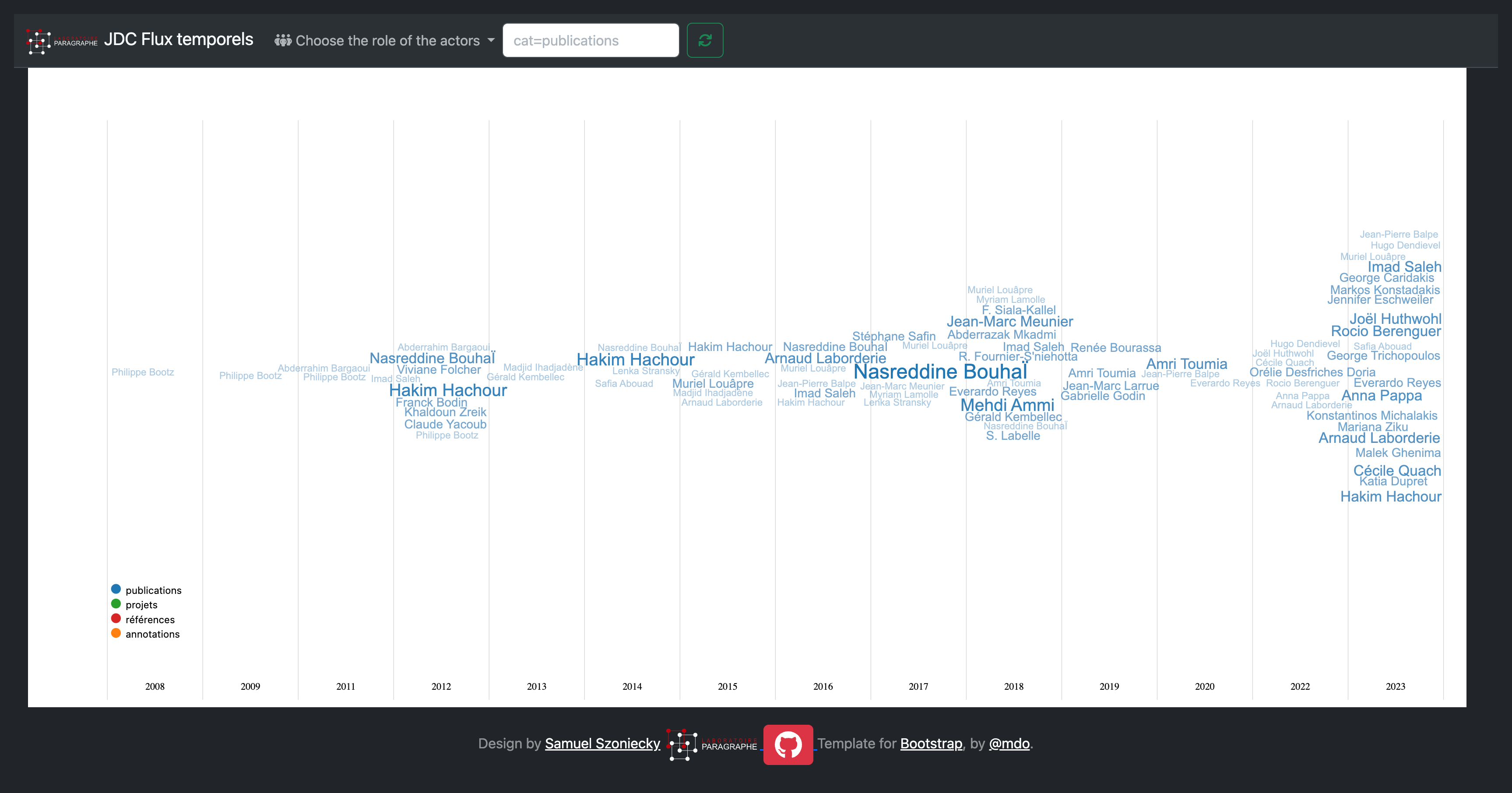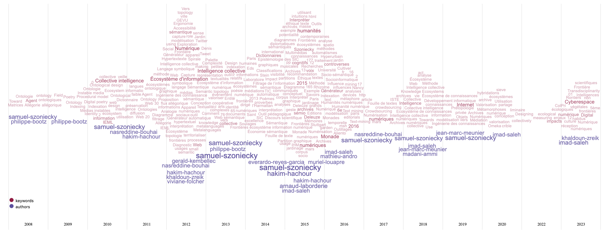 Grâce à ces activités, j’ai eu la chance de dialoguer avec de très nombreux chercheurs dont la liste complète serait trop longue à faire figurer ici, mais que je remercie vivement pour ces conversations où l’échange de points de vue parfois très différents donne à la recherche un goût à la fois subtil, surprenant et aventureux. Une première vision de ces relations est visible dans le diagramme ci-dessous Figure 2.2 qui montre l’évolution de mes productions scientifiques déposées dans HAL suivant deux catégories : celle des mot-clés utilisés pour décrire ces dépôts et celle des collaborateurs ayant participé à la production :