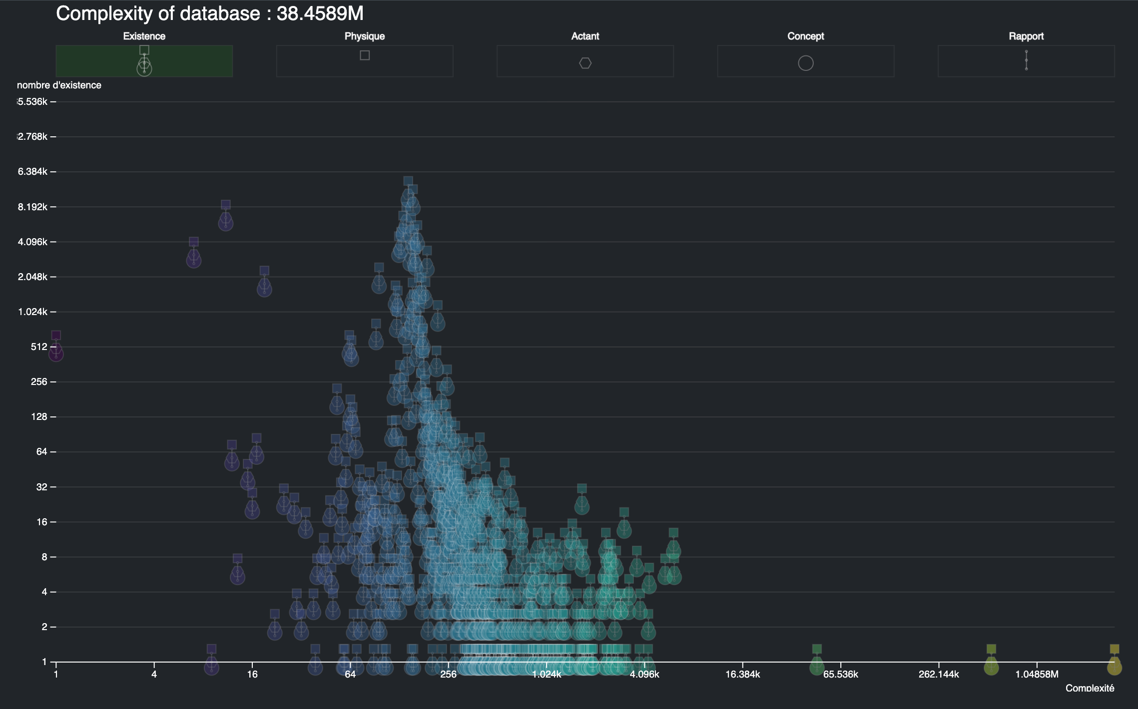 Les représentations précédentes Section 2.2 et Figure 5.2 , basées sur la classe des objets nous informe sur l’importance de chaque type d’existence qui peuplent notre écosystème de connaissances mais ne disent rien sur l’importance de ces existences. En fait, ces présentations créent un angle mort en ne montrant pas la complexité de l’écosystème puisqu’elles ne prennent pas en compte le détail des valeurs (dimension physique) de chaque propriété (dimension concept) ni l’actant qui exprime les rapports entre les propriétés et les valeurs, encore moins l’évolution de cette complexité au fur et à mesure que l’écosystème se transforme.