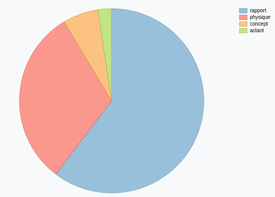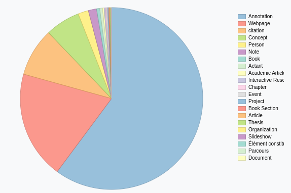 Le graphique montre que les deux tiers des objets dans l’écosystème (61 120 = 60 %) sont des annotations qui créent un rapport entre un document, un actant et un concept. Ce sont les 4 dimensions existentielles que nous utilisons pour modéliser les écosystèmes de connaissances et que nous présenterons en détail plus loin Section 2.2 .