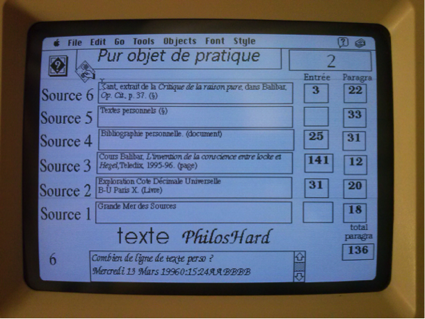 1De l’histoire de l’art aux sciences de l’information et de la communication mon parcours intellectuel m’a donné tout d’abord la chance de découvrir l’art et d’apprendre à voir par la pratique intensive des œuvres et leurs analyses complexes. Plus particulièrement, lors de mes recherches en maîtrise d’histoire de l’art sur la gravure au XVIIIe siècle j’ai analysé à travers une exploration des catalogues de ventes, comment un des premiers réseaux de diffusion à grande échelle des images contribuait à l’histoire du goût. Ce premier travail de recherche m’a sensibilisé à l’importance des bases de données documentaires pour les recherches et aux outils nécessaires pour les exploiter efficacement. Sans le savoir à l’époque, je commençais mon exploration des humanités numériques que je continuais dans mon travail de DEA sur l’influence de John Cage en menant une première expérimentation sur la cartographie des affinités (Rodighiero, 2021). Cette recherche m’a fait découvrir quatre notions fondamentales des théories du chaos : les catastrophes (Thom, 1975), les objets fractals de Mandelbrot, les attracteurs étranges selon Ruelle et les structures dissipatives selon Prigogine (Gleick, 1999). Surtout, j’ai compris les rapports intimes entre ces notions et les sciences humaines à travers mes lectures simultanées de (Deleuze, 1988; Foucault, 1990; Guattari, 1992) et comment ces phénomènes relèvent de la complexité (Morin, 1981, 1985, 1992, 1995, 2001, 2006). De cette période datent mes premières rencontres intellectuelles d’importances au centre Thomas More du couvent de la Tourette (Cavalin, 2017) où j’ai eu la chance de discuter avec Michel Serres, Regis Debray, Michel Pastoureau, Pascal Ory et les frères dominicains… C’est à cette période aussi que je mène mes premières expériences de générations hypertextuelles avec le logiciel Hypercard2 et que je découvre comment le chaos informatique est utile aux sciences humaines en ayant l’intuition d’une machine à stimuler les connaissances par une mise en situation synesthésique Figure 2.1…