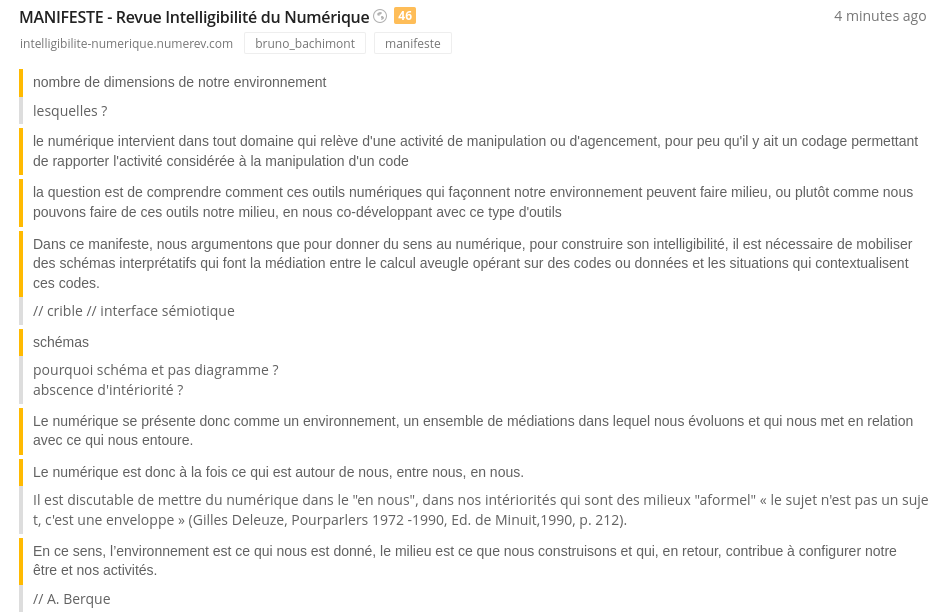 Cette copie d’écran montre les parties de l’article que j’ai sélectionnées (marge jaune) et les notes que j’ai prises pour la sélection (marge grise). En ce référent à cette page d’annotation, il est pratique de retrouver rapidement ce qui m’a semblé pertinent et pourquoi18.