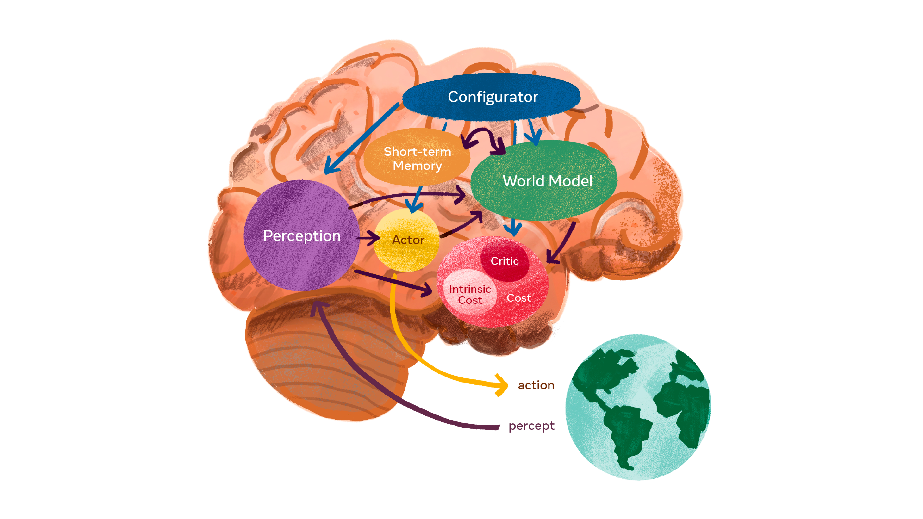 À l’inverse du modèle d’architecture de la perception que propose Yan LeCun (LeCun, n.d.), un des “technopapes” de l’IA connexionniste, dont la représentation visuelle Figure 2.2 symbolise parfaitement la disproportion entre son cerveau est notre planète, nous ne considérons pas la perception uniquement à travers une cervelle dont la transcendance extérieure à son environnement exerce son pouvoir sur un objet. Pour nous, l’information et la communication sont des processus qui se déploient dans un écosystème complexe (Bateson, 2008; Lévy, 1990; Maturana & Varela, 1994; Morin, 1995) qui émerge de l’autopoïèse et de l’auto-organisation d’une multitude d’existences possédant chacune un cerveau en rapport les uns avec les autres pour constituer une noosphère :