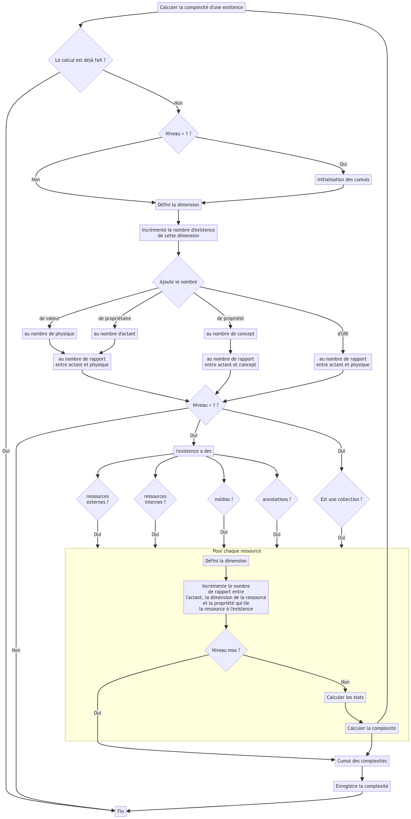 Il est important de noter que le calcul de la complexité d’une existence tel qu’il est aujourd’hui, ne prend pas en compte l’intégralité du réseau informationnel dont fait partie cette existence, mais uniquement les éléments qui la constitue. Par exemple, pour le calcul d’une existence A, on ne prend pas en compte les existences B, C ou D dont la valeur d’une de leurs propriétés est A. Nous avons fait ce choix pour minimiser le temps de calcul et parce que nous pensons qu’une existence peut se définir uniquement par les éléments qui la composent sans prendre en compte les existences qu’elle contribue à définir. Ce choix de calcul est bien évidemment discutable et revient à s’interroger sur les rapports entre la transcendance c’est-à-dire la puissance de ce à quoi l’existence participe et l’immanence c’est-à-dire la puissance de ce qui compose une existence. Le débat est ouvert.↩︎