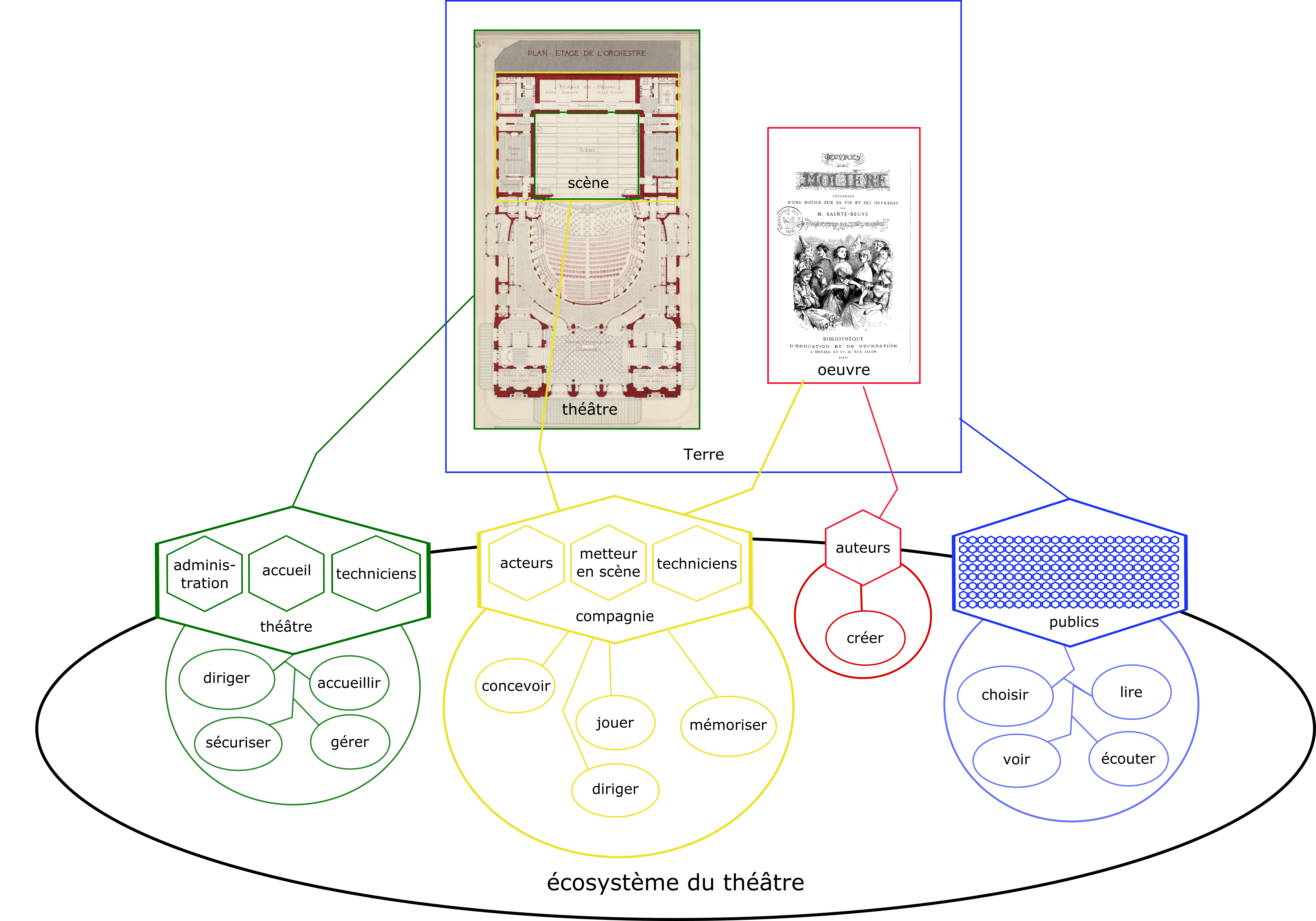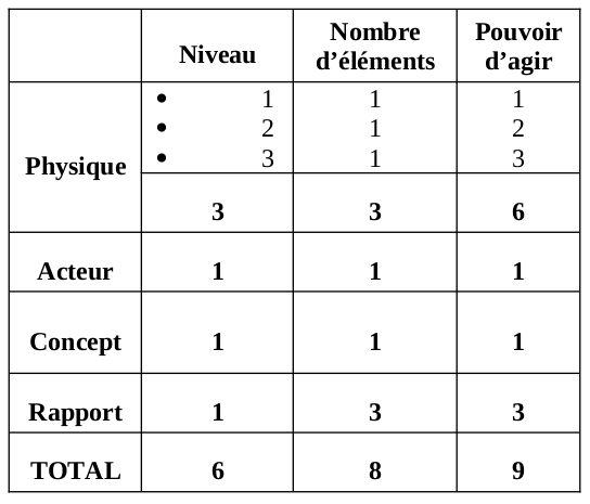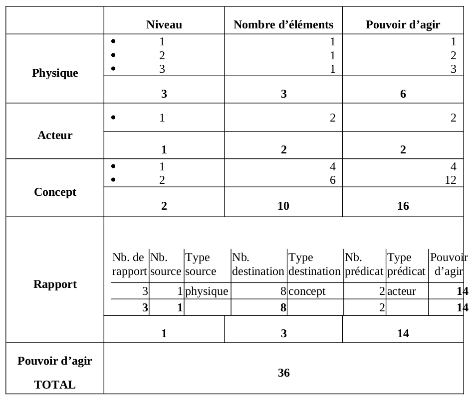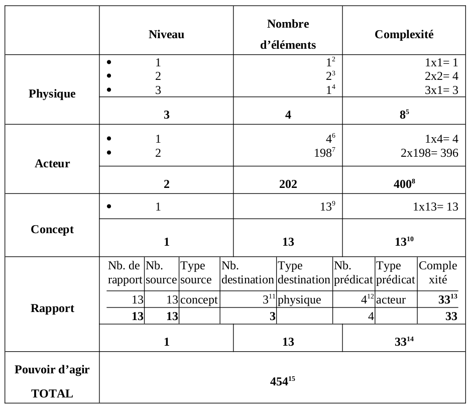 Explication des notes du tableau 2 : Terre 3 : Œuvre et héâtre 4 : Scène 5 : Somme des éléments de la cellule supérieure (1+4+3=8) 6 : Théâtre, compagnie, auteurs, publics. 7 : Nombre de personnes composant les publics. 8 : Somme des éléments de la cellule supérieure (4+396=400) 9 : Diriger, accueillir, sécuriser, gérer, concevoir, jouer, mémoriser, diriger, créer, choisir, lire, voir, écouter. 10 : Report de la donnée figurant dans la cellule supérieure, car, dans ce cas, aucune somme n’est nécessaire. 11 : Terre, œuvre et théâtre. 12 : Théâtre, compagnie, auteurs, publics. 13 : Somme du nombre de rapports (13), du nombre de sources (13), du nombre de destinations (3) et du nombre de prédicats (4). 14 : Report de la donnée figurant dans la cellule supérieure, car, dans ce cas, aucune somme n’est nécessaire. 15 : Somme des complexités des physique (8), des acteurs (400), des concepts (13) et des rapports (33). 16 : Pour les trois dimensions physique, acteur et concept, les chiffres du tableau correspondent au nombre d’éléments de chacune des dimensions pour chacun des niveaux de détails. Par exemple pour la dimension physique le niveau 1 est composé de 1 élément (Terre), le niveau 2 de 2 éléments (théâtre, œuvre) le niveau 3 de 1 élément (scène). Le pouvoir d’agir correspond à la multiplication du nombre d’éléments par le niveau de détails. Pour les rapports les chiffres correspondent au nombre d’éléments pour chaque triplet « source – destination - prédicat », la complexité est la somme de ces éléments.↩︎