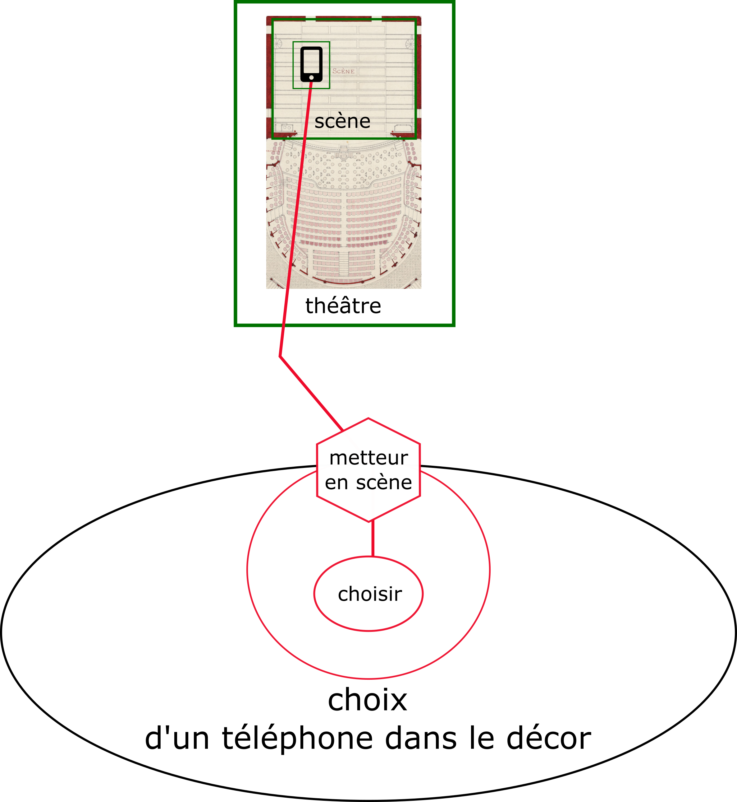 Dans le cas d’un élément physique, son pouvoir d’agir est de l’ordre du choc : il informe de l’espace qu’il occupe par contact avec sa matière. C’est par exemple un téléphone portable dans la poche d’un spectateur ou placé dans le décor sur la scène. Dans le premier cas, le pouvoir d’agir s’exprime uniquement par rapport à une personne alors que dans le cas d’un objet du décor le pouvoir d’agir touche l’ensemble de l’écosystème du théâtre parce qu’il occupe une place tout à fait particulière : il est sur scène. Dès lors, cet élément physique devient un élément important puisqu’il exprime le pouvoir d’agir du metteur en scène qui a fait le choix de mettre cet objet physique dans le décor. Ce choix se modélise dans la dimension des rapports par une relation entre le téléphone sur la scène (dimension physique), le metteur en scène (dimension acteur) et le choix (dimension concepts).