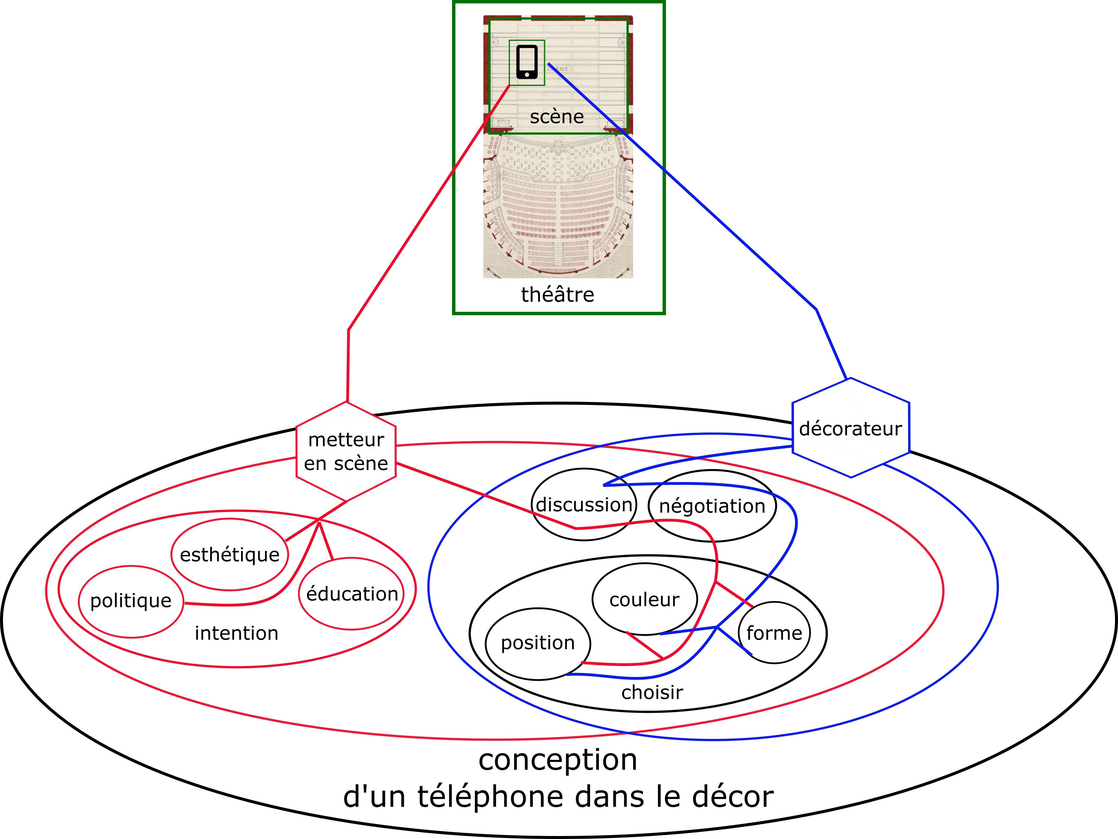 De ce point de vue et suivant le calcul présenté dans la figure ci-dessus Figure 2.18 (b) le pouvoir d’agir du téléphone est de 9. Ce chiffre s’obtient parce que nous ne détaillons pas la modélisation en précisant, par exemple dans la dimension des concepts, à quel domaine le concept de choisir s’applique (la forme, la couleur, la position sur scène…) ou encore quelles intentions le metteur en scène met dans ces choix. De même, nous pouvons ajouter le scénographe et son équipe ce qui augmente le pourvoir d’agir de la dimension des acteurs, mais aussi celui de la dimension conceptuelle en faisant apparaître la notion de discussion et/ou de négociation. En prenant en compte ces nouveaux points de vue Figure 2.19, le pouvoir d’agir du téléphone augmente (36) Figure 2.18 (b) parce que le pouvoir de discernement du modélisateur augmente.