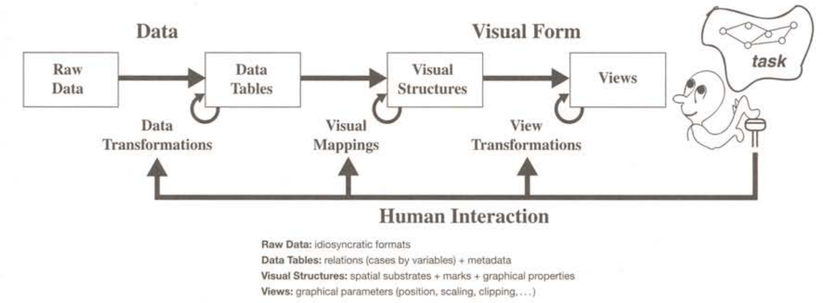 Depuis une trentaine d’années, je m’intéresse à la modélisation des données et plus particulièrement à la question de savoir comment cette modélisation est utile pour créer les conditions de l’expérimentation des connaissances. Dès mes travaux en maîtrise d’histoire de l’art (1994), je me suis familiarisé à la création de bases de données qui pour moi à cette époque, prenaient la forme d’un simple tableur. Puis en DEA (1995), j’ai découvert avec le logiciel Hypercard1 comment transformer mes tableurs en collections de fiches hypertextuelles (Deuff, 2019) et surtout en interfaces dynamiques et interactives. Ce passage à Hypercard m’a fait comprendre les relations intimes entre les données, leurs représentations et leurs manipulations que (Card, Mackinlay, & Shneiderman, 1999) a bien schématisé Figure 2.1 :