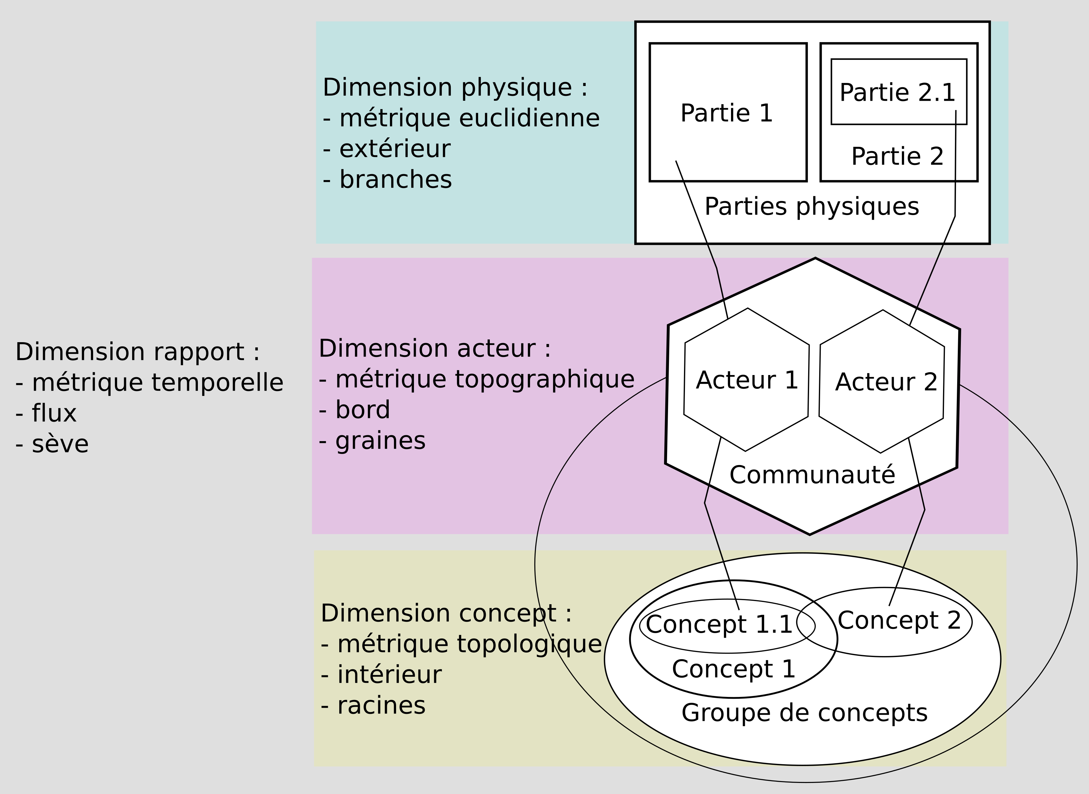 Entre la dimension des physicalités organisée en hiérarchies et celle des concepts organisée en topologies, la dimension des actants organise les connaissances à la fois sous la forme de topos et de chôra (Derrida, 1997; Zamora, 2003). Topos et chôra sont deux manières complémentaires de modéliser soit pour le topos sous la forme d’une identité par exemple “Université Paris 8”, soit pour la chôra en définissant ce que le lieu génère comme activités, ce que sont ses dynamiques génératives, par exemple dans le cas de Paris 8 : recherches et enseignements.