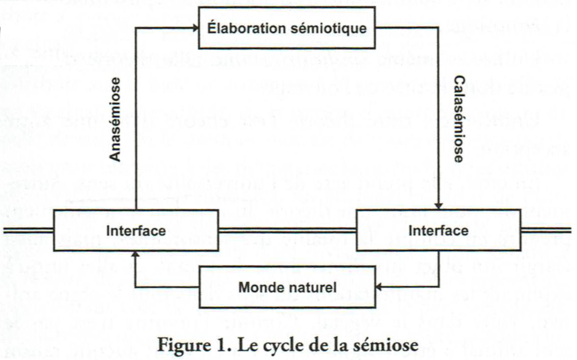 Le cycle de la sémiose met donc en jeu successivement trois processus correspondant à trois pouvoirs : le pouvoir de discernement (anasémiose), le pouvoir de raisonner (élaboration sémiotique), le pouvoir d’agir (catasémiose). Aux deux extrémités du cycle se trouve l’interface qui transforme la matière en pensée (discernement) et la pensée en matière (agir), elle est le « crible » par lequel passent les « pulsations existentielles » (Berque, 2009, p. 402) qui plongent dans l’intimité de nos élaborations et rebondissent jusqu’à la surface de nos expressions en élimant les « valeurs » superflues et en se chargeant des « valeurs » importantes. Ce crible, Descola propose de le structurer à partir de « matrices ontologiques » (Descola, 2005, p. 323) qui définiront les rapports entre physicalités et intériorités. (Hofstadter & Sander, n.d., p. 233) nous expliquent que nous élaborons ce crible par adoption et création d’un réseau d’analogies de plus en plus complexes. Ces auteurs venant de la sémiologie, de la géographie, de l’anthropologie, de l’intelligence artificielle et de la psychologie s’accordent pour dire qu’il est possible de modéliser cette interface, ce crible, ces rapports, ce réseau d’analogies qui va guider nos affects pour augmenter ou diminuer ce que nous discernons parce que nous agissons et vice-versa.